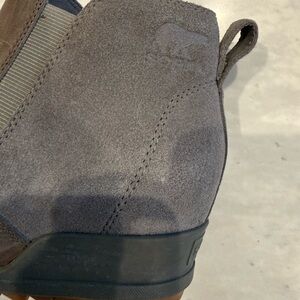 Amazing for all seasons. Waterproof Sorel Evie Chelsea Boots in Quarry nubuck leather. Hidden mule heel typical of Sorel. Soles have excellent traction and minimal wear. Terrific for snowy and rainy days. Women’s size 7.5 US/EU 38.5. These run true to size for me. Very good preloved condtion. No real scuffs (marks are typical of the oiled leather nature).