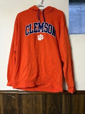Champion crewneck hoodie in bright orange. Features bold Clemson lettering and a white paw emblem. Pullover style with drawstring hood and front kangaroo pocket. Soft, casual design for everyday wear.
