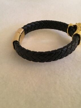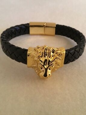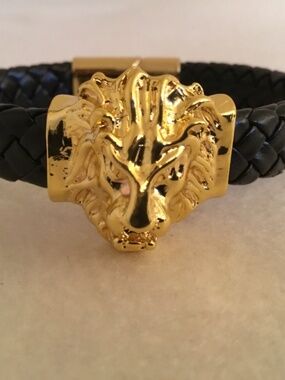 Brand new men’s black woven faux leather golden lion head bracelet. 8.66” circumference. Sliding clasp closure.