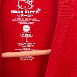 Festive red sweatshirt with Hello Kitty and Christmas tree design. Features 'Merry & Bright' text. Perfect for holiday fun.