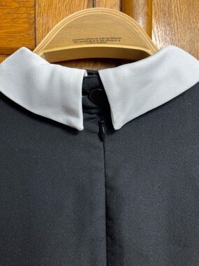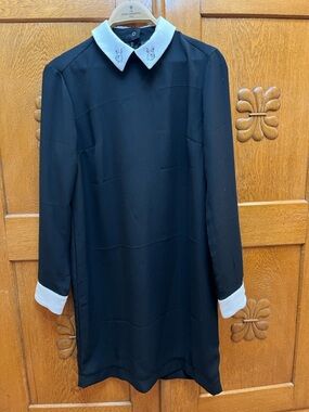 This dress features a signature white Peter Pan collar adorned with vintage-inspired rabbit illustrations. This piece is a black shift or mod-style dress made from a crepe-like polyester material. It includes long sleeves and a back zipper with a snap closure at the neck.