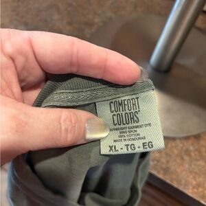 Comfort Colors branded tee in olive green. Simple solid color with visible tag detail. Casual, everyday cotton look.