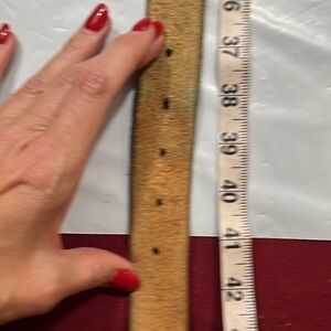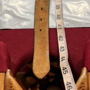 Hand-tooled leather belt with repeating heart motif. Raised black detailing contrasts rich brown leather. Brass-toned initials "HFP" accent the strap. Classic vintage styling. Versatile accessory for casual looks.