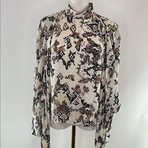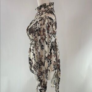 Printed satin (100% Viscose) Top. Mock neck. Long sleeves. Back zipper closure. 22.5" from shoulder to hemline. Made of imported materials, finished in the USA. Country of origin designation as provided by vendor and/or manufacturer.