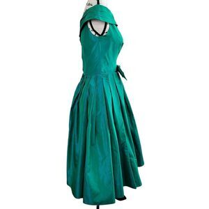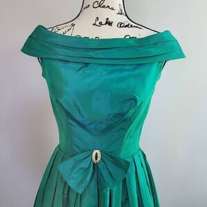 Vintage 1950s green blue iridescent cocktail dress off shoulder bow detail retro