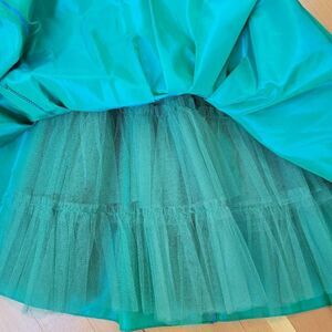 Vintage 1950s green blue iridescent holographic cocktail dress taffeta off the shoulder with pleated details and a front bow pin with a gem brooch in the middle, tea length or knee length. In great pre owned condition, there are a couple of spots on the chest area as shown in photos.