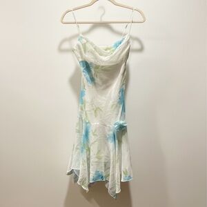 A. Byer asymmetrical slip dress. Lightweight fabric with soft cowl neckline. Blue and green floral print on a white base. Spaghetti straps and handkerchief hem. Feminine and breezy look.