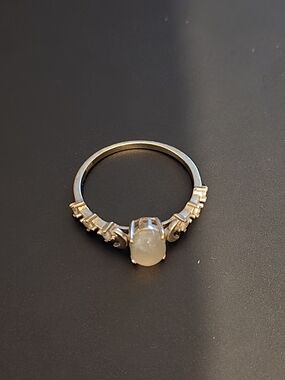 Elegant silver ring featuring a cabochon white moonstone center. Detailed band with small accent settings on each side. Subtle iridescent glow for refined style.