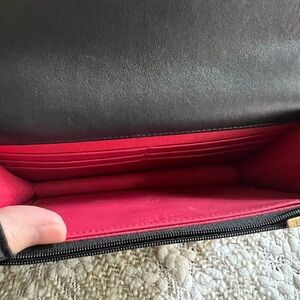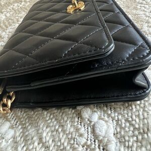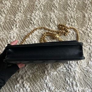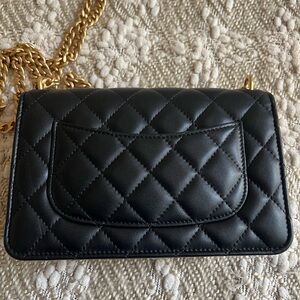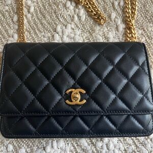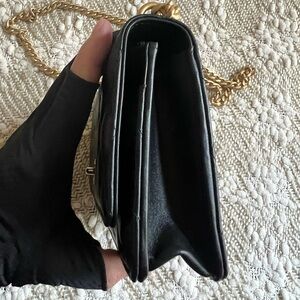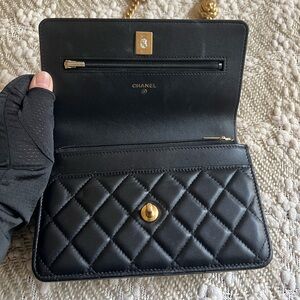 Features a bold gold chain strap and CC clasp. Camellia accent on the chain adds signature detail.