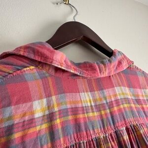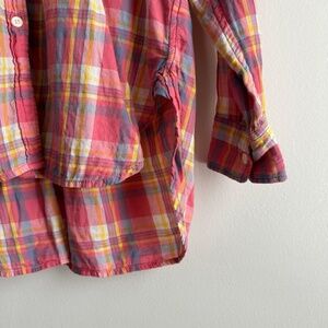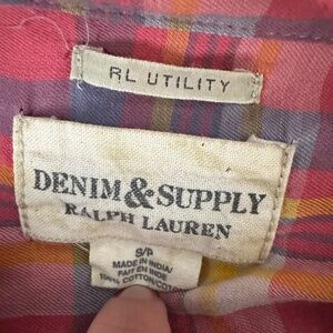 Description: RL Utility Ralph Lauren Denim & Supply lightweight 100% cotton plaid button-down shirt. curved hemline. springlike colors.