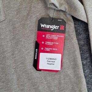Keywords: Wrangler shirt, men's henley, long sleeve, relaxed fit, oatmeal heather, workwear, utility loop, three button placket, tagless neck, casual, outdoor, labor, durable