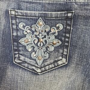 Factory Distressed in strategic places, Medium wash, Zip Front, embellished back pockets. Our Inv# WC 095