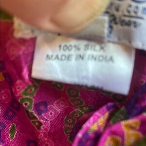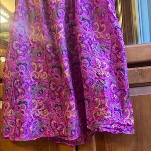 This stylish 100% Silk camisole top in vibrant purple hues with pink, green and gold is designed with a sleeveless cut, making it ideal for layering or wearing on its own. The soft fabric drapes beautifully, offering a comfortable and chic look for any occasion.