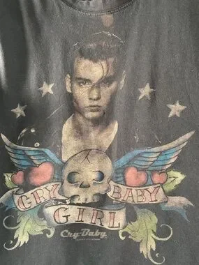 Vintage small women’s Tultex 90’s Cry Baby Johnny Depp Tee small bleach spot top center