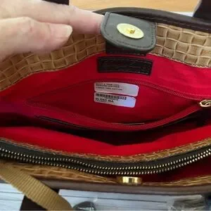 New with tags Dooney & Bourke Lilliana leather tote purse. In natural and brown leather, red cotton interior and gold hardware. Has handles, adjustable leather strap, leather logo key chain and small wristlet pouch, feet on bottom, snap top closure with interior drop in pockets and zip pocket and center zipper compartment. See photos for measurements. Satchel, shoulder bag, tote, crossbody