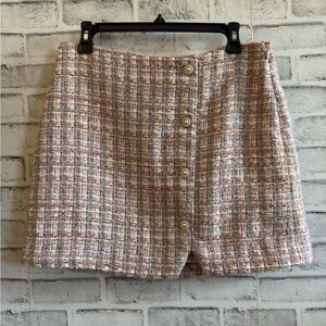 NWOT! Women’s. House of Harlow 1960. Multi colored tweed mini skirt. Faux crystal and pearl buttons. Size Medium.