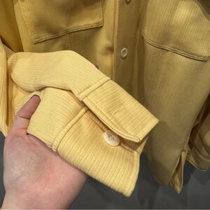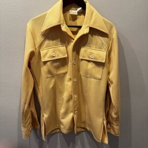 Warm yellow button-front jacket. Features two chest flap pockets and a retro pointed collar. Soft textured fabric with full-length sleeves. Versatile, casual layering piece.