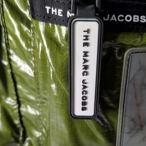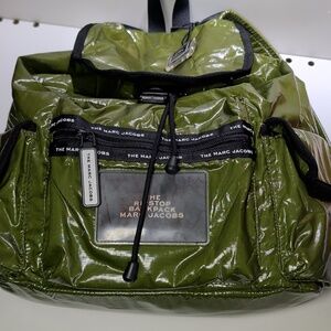 Stylish Marc Jacobs backpack in glossy olive green. Multiple exterior pockets for easy access. Drawstring closure with top flap. Padded straps for comfortable wear. Branded tape and logo patch detail.