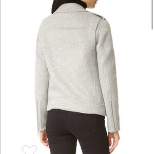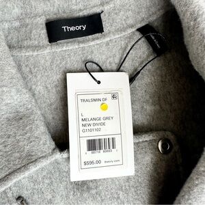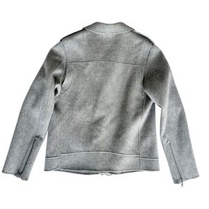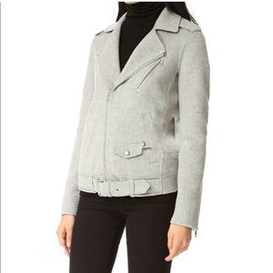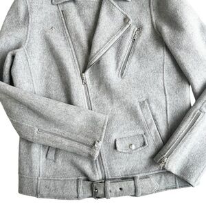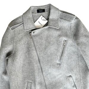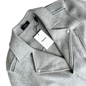 Theory Tralsman gray moto biker jacket. So many amazing details! Asymmetric front zip. Should epaulets. Snap and zipper pockets. Attached belt adjusts in front. Zippers on sleeve cuffs. 90% wool, 10% cashmere. Melange Grey New Divide. Perfect for cool autumn fall days! Brand new with tag attached. No flaws.