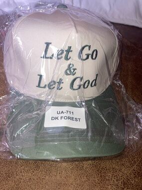 Two-tone baseball cap with embroidered "Let Go & Let God" on front. Light beige crown with dark forest green bill and embroidery. Casual, spiritual statement piece. Adjustable back closure.