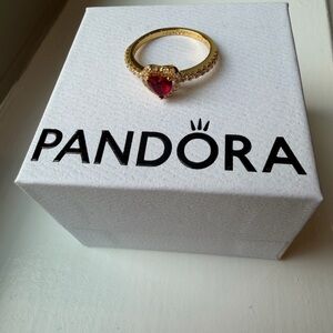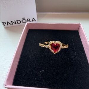 Gold Pandora ring with a heart-shaped red center stone. Pave-set clear accents surround the heart. Delicate band with sparkling detail. Romantic and eye-catching.
