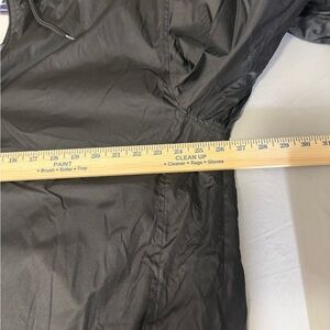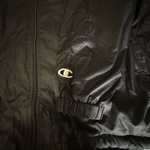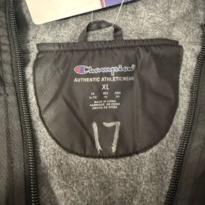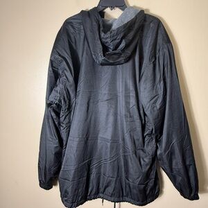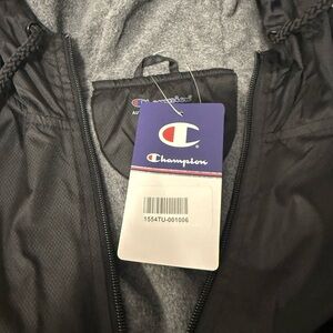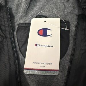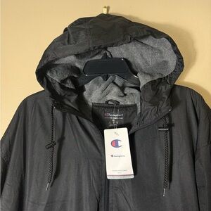 Champion hooded full zip windbreaker jacket men’s size XL, brand new with tags (NWT), black exterior with gray fleece lined interior, 100% polyester shell, lightweight insulated feel, longer length fit for added coverage, adjustable drawstring hood and hem, elastic cuffs, full zip front closure, athletic athleisure outdoor performance jacket perfect for golf hiking running training gym casual streetwear layering windbreaker rain shell everyday wear, Champion “C” logo on sleeve, made in China, clean new condition no flaws, see photos for exact measurements and details.