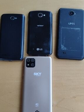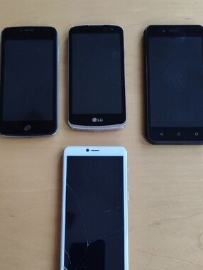 Not tested. As is. might work or not. Different brands.Four smartphones in varied colors. Includes three dark-front phones and one white-front device. Screens visible; one has a cracked display. Good for parts, repair projects, or backup use.