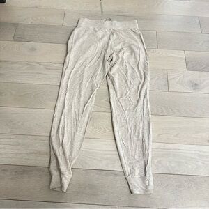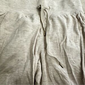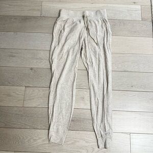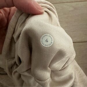 Soft sand-colored joggers from lululemon athletica. Elastic waistband with drawstring. Comfortable knit fabric for everyday wear.