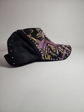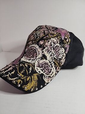 Black baseball cap featuring pink floral embroidery and sequin detailing. Gold-tone threadwork adds elegant contrast. Studded trim along the brim creates a modern, edgy finish. Lightweight and stylish for everyday wear.