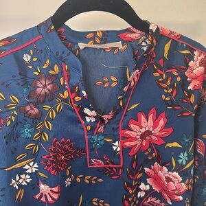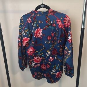 This stylish blouse from LOFT features a striking graphic design in blue and red, complemented by a mandarin collar. The lightweight fabric offers a comfortable fit, making it a versatile addition to any wardrobe. Perfect for a day in the office. Elastic around the cuffs.