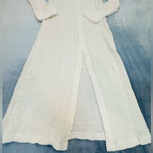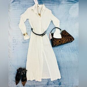 Lightweight white button-front shirt dress with a relaxed, flowing silhouette. Features long sleeves and a classic collar for versatile styling. Pair with a belt or wear open as a layer. Comfortable, breathable fabric ideal for day-to-evening wear.