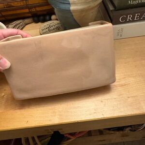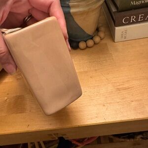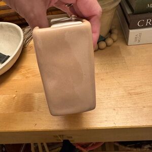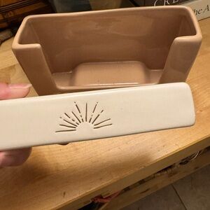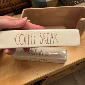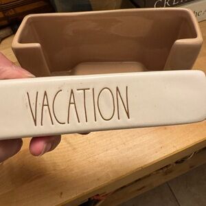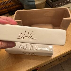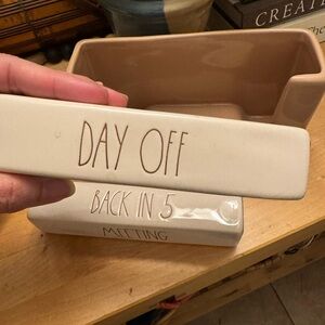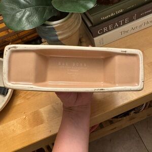 Rae Dunn ceramic tray with simple raised lettering. Earthy brown interior and cream rim. Minimalist farmhouse style. Versatile for decor or storage.