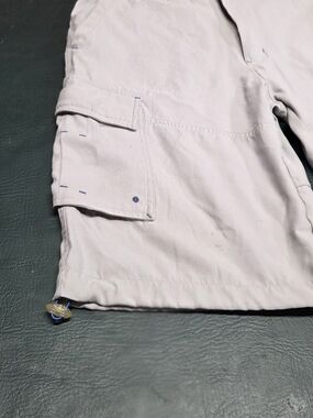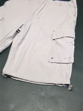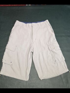 No Boundaries Versatile beige cargo shorts with multiple pockets for everyday carry. Lightweight fabric and a relaxed fit for all-day comfort. Neutral beige color pairs easily with casual tops. Functional pocket details enhance utility and style. MISSING BUTTON.