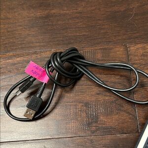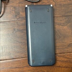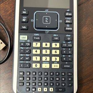 TI-Nspire CX graphing calculator. Black body with silver trim and yellow keypad accents. Includes USB cable charger. Slightly used but great condition with digital format
