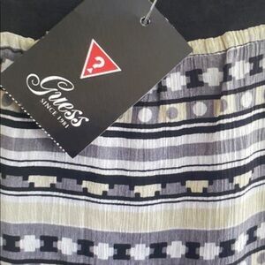 Guess tank top with black and white horizontal stripe pattern. Scoop neckline with contrasting black trim. Soft, lightweight knit for easy wear. Flowy silhouette ideal for layering or warm days.