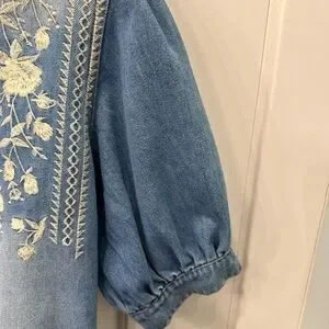 Elevate a wardrobe with this stunning "Western Belle" denim bodysuit, new with tags and in size medium. This piece features a beautiful light-to-medium wash, bold white floral embroidery on the front yokes, and trendy puff sleeves with elastic cuffs. The bottom half is a comfortable, stretchy black material with a snap closure for easy wear.