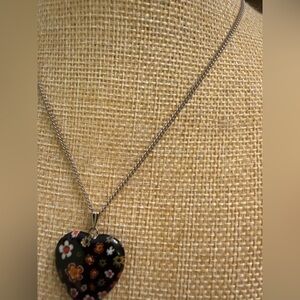 Delicate black heart pendant with petite floral accents. Sleek silver-tone chain adds modern contrast. Lightweight and versatile for everyday wear. The black floral design brings a feminine, playful touch.