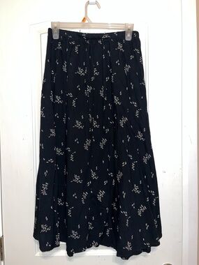 Lightweight black midi skirt with a delicate white floral print. Elastic waist for easy, comfortable wear. Flowy silhouette ideal for casual or dressed-up looks. Machine-washable fabric for easy care.