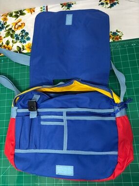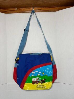 Calgary Stampede colourful kids messenger crossbody tote bag. Lots of pockets. Excellent condition. Horse wagon picture on front. Does have a mark across the back on the red, as pictured. Also a mark on the rodeo theme picture on the front.