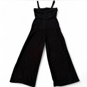 Sleek black jumpsuit with a fitted button-front bodice and adjustable straps. Flows into dramatic wide-leg pants for an elegant silhouette. Versatile style for day or evening looks.