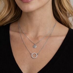 This elegant layered necklace set offers a clean, minimalist look with a modern touch. The combination of a simple disc pendant and a sparkling circle pendant creates a versatile style that can be dressed up or worn casually. Perfect for layering or wearing individually, making it a great addition to any jewelry collection. Style vibe: minimalist, modern, everyday chic.