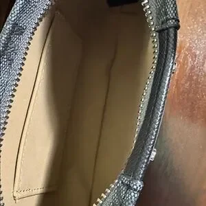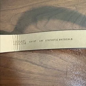 Signature MK logo print. Center panel and trim in black textured leather. Metal logo plate on front. Adjustable belt strap included.