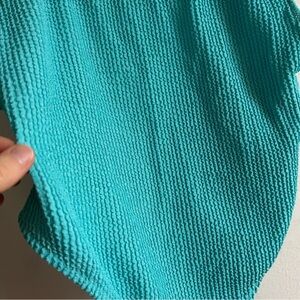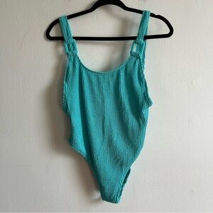 Make a splash this season with the Aerie Size L Blue Cheekiest Shimmery One Piece Swimsuit. Designed for a bold yet flattering fit, this swimsuit features a vibrant blue hue and a shimmery finish that catches the light beautifully, adding a touch of glamour to your poolside look. The cheekiest cut provides a flattering, high-rise fit, while the soft fabric ensures all-day comfort. Whether you’re lounging by the beach or enjoying a swim, this one-piece offers both style and confidence. Textured fabric