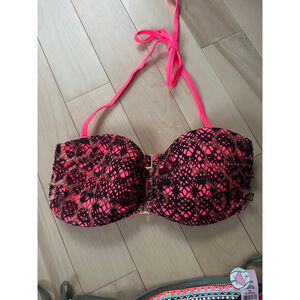 Mixed brand bikini set with neon lace bandeau top and tribal tie-side bottom. Contrast textures with bright pink lining and crochet-style overlay on the top. Bottom has adjustable side ties and subtle printed trim. Clean Y2K look. Both pieces new with tags.