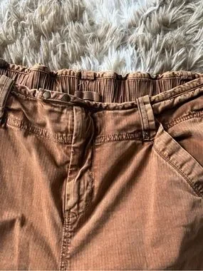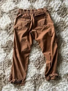 High-rise casual pants by We The Free. Elastic waistband with drawstring. Subtle sheen fabric. Functional front detailing. Warm rust-brown tone.