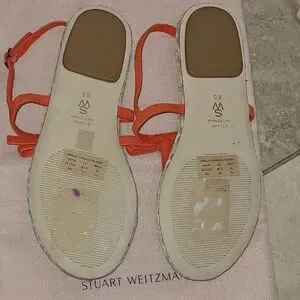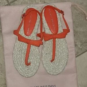 Chic Stuart Weitzman sandals in vibrant orange. Features a stylish cream leather sole. Ideal for summer outings.