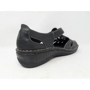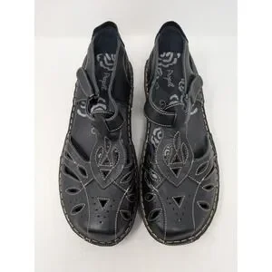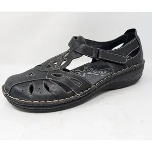 Propet leather comfort sandals feature a closed-toe Mary Jane silhouette with intricate laser-cut floral patterns and contrast topstitching. Designed for all-day wear, these shoes include a secure hook-and-loop strap closure and a cushioned footbed with a decorative rose print. The durable rubber outsole provides traction, while the lightweight wedge heel offers a subtle lift. Perfect for casual outings, these versatile flats combine a classic aesthetic with supportive construction.