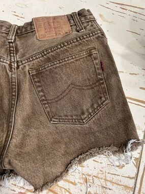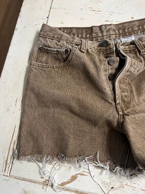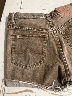 High-rise brown denim shorts with a raw, frayed hem for an easygoing look. Five-pocket styling and a button-fly for classic denim detail. Soft, washed brown denim offers comfortable, everyday wear. Pairs effortlessly with tees and light layers for casual outfits.