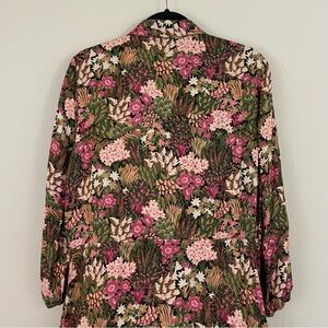 Light floral blouse with pink blooms and green foliage. Delicate feminine print. Easy to pair with skirts or trousers.