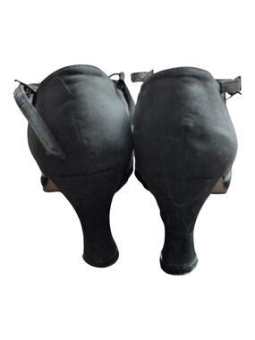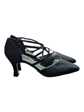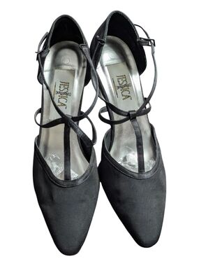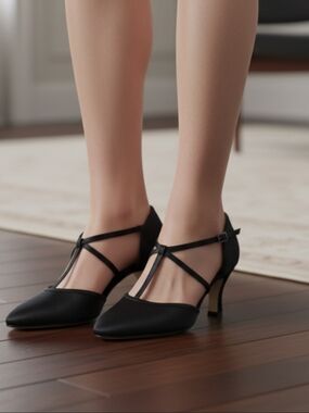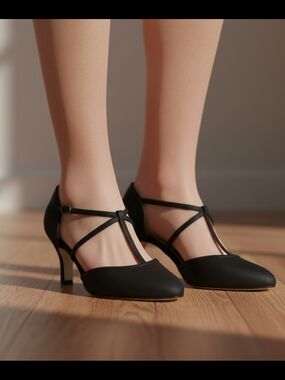 Black T-strap pumps with a pointed toe. Mid-height heel for elegant posture. Adjustable ankle strap for a secure fit. Smooth finish for a polished look.